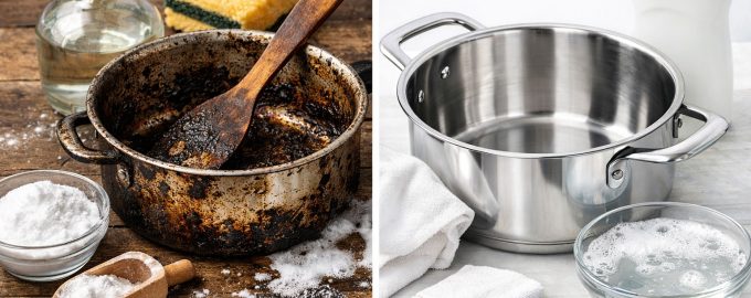 Когато дъното на тенджерата се покрие с черен слой от изгоряла каша или сладко, не бързайте да го търкате с нож. Съществуват методи, които разтварят замърсяванията без механично въздействие.