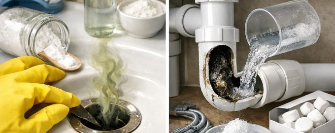 Сода за хляб и оцет. Комбинацията от тези компоненти създава химическа реакция, която буквално „изяжда“ органичните отлагания. Необходимо е да изсипете половин чаша сода за хляб в канализацията, да я залеете с чаша оцет и да затворите плътно отвора за 20 минути.