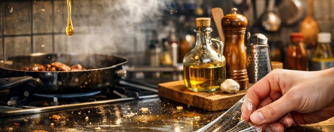 Основният виновник за залепването е следният мазнина за готвене. При пържене или задушаване малки капчици масло се издигат във въздуха заедно с парата. Тези частици се утаяват върху всички налични повърхности – от работните плотове до плотовете на шкафовете. С течение на времето, под въздействието на кислород и топлина, мазнината се окислява и се превръща в твърдо вещество.