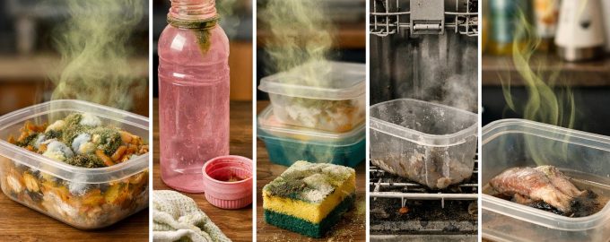 Противно на общоприетото схващане, повърхността на пластмасата не е напълно гладка. При многократна употреба в нея се образуват микропукнатини и драскотини от приборите за хранене. В тези пори проникват частици мазнина и органични остатъци от храна. С течение на времето. окисление на липидитеи пластмасата започва да мирише на застояла храна, дори ако визуално изглежда напълно чиста.