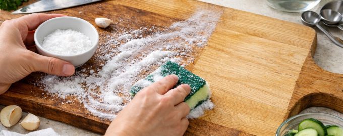 Лимон и едра сол. Това е най-ефективният дует за отстраняване на упорити петна. Солта действа като мек абразив, а лимонената киселина – като естествен абразив Антисептик и белина. Поръсете дъската със сол и я натъркайте енергично с половин лимон.