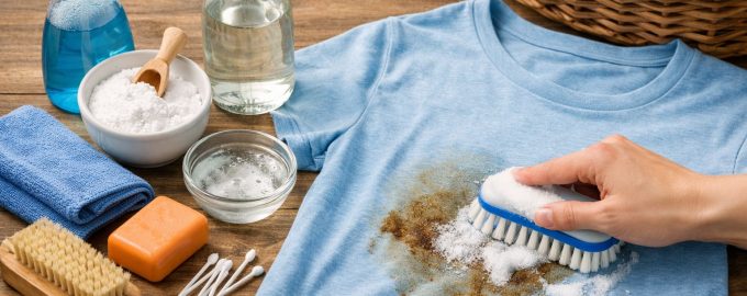 За светли вещи, изработени от плътен памук, можете да използвате смес от сода за хляб и водороден пероксид. Тази смес не само отстранява мазнините, но има и лек избелващ ефект, като връща на плата първоначалния му вид. Когато работите с цветни или тънки тъкани, си струва предварително да проверите ефекта на всеки продукт върху незабележим участък от шева.
